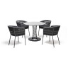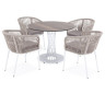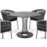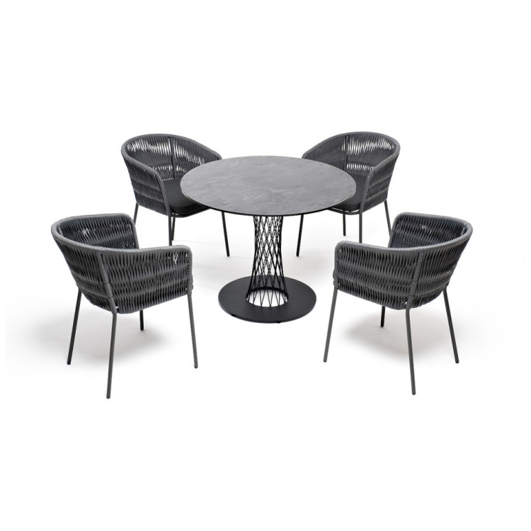 Обеденная группа "Диего" является стильным и практичным решением для обустройства кухни или жилой зоны, она идеально сочетается с различными интерьерами благодаря универсальности использованных материалов и цвета. Она подходит как для ежедневного использования, так и для приема гостей, обеспечивая удобство сидения и качественное исполнение всех элементов. "Диего" обеденный стол из HPL круглый ?100см, цвет "серый гранит" 1шт. 1 000Х1 000Х750, "Бордо" плетеный стул из роупа, каркас стальной серый (колос), роуп серый, ткань серая 4шт. 570Х620Х800,