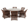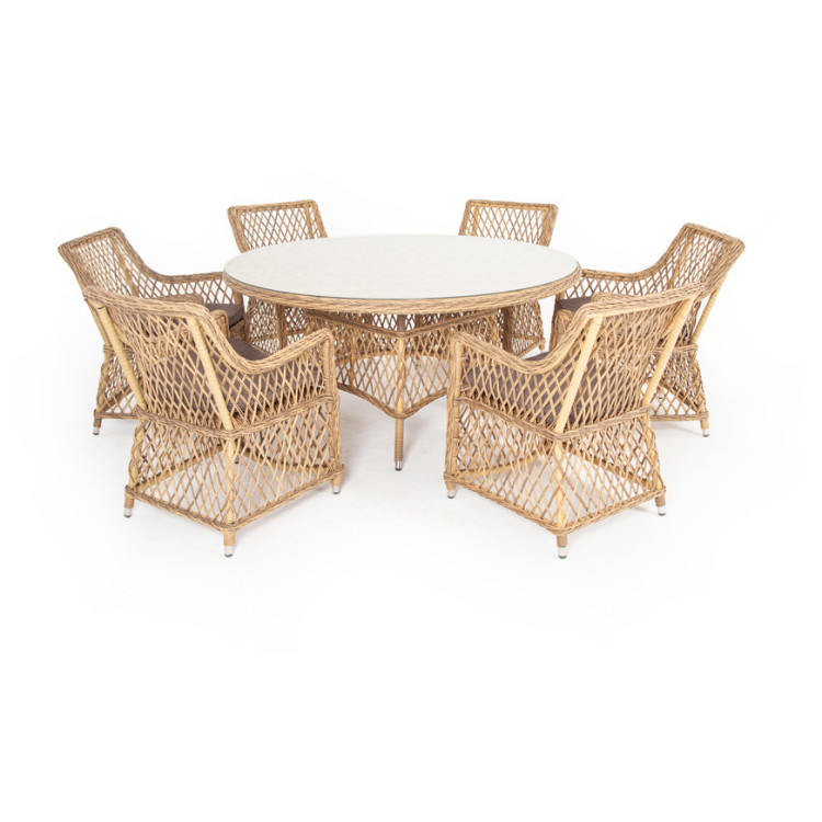Вся мебель изготовлена из долговечного и легкого алюминия, обтянутого синтетическим ротангом. На столе для удобства эксплуатации предусмотрена столешница из ударопрочного закаленного стекла 5 мм. Стулья укомплектованы подушками на сидениях. "Эспрессо" плетеный круглый стол, диаметр 150 см, цвет соломенный 1шт. 1 500Х1 500Х750, "Латте" плетеное кресло из искусственного ротанга, цвет соломенный 6шт. 550Х660Х850,